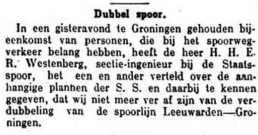 de spoorlijn. De lijn blijft dus enkelbaans. In 1914 gaat men bezig met verdubbeling van de lijn Meppel-Groningen. In februari van datzelfde jaar verklaart sectie-ingenieur Westenberg van het Staatsspoor op een bijeenkomst van ‘belanghebbenden bij de spoorweg’ dat een dubbel spoor tussen Groningen en Leeuwarden (deel Staatslijn B) ‘niet meer veraf is’.