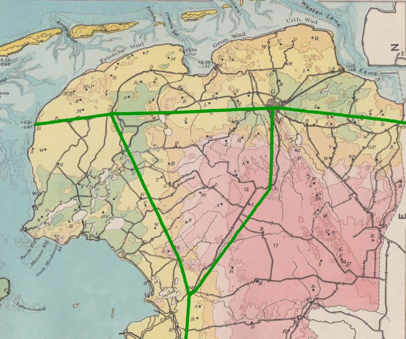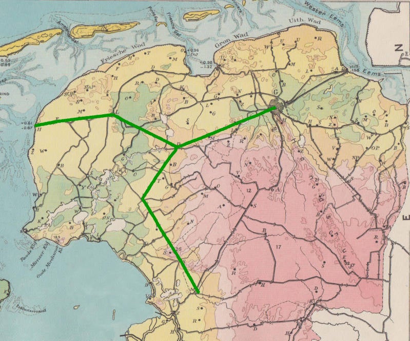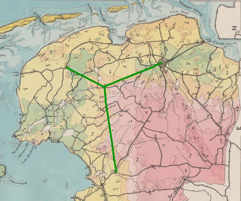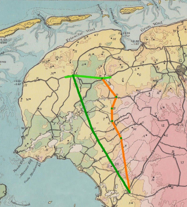 De spoorlijn tussen Groningen en Harlingen, zoals de concessionarissen baron Sloet en jonkheer Reuchlin zich deze voorstellen (1858).