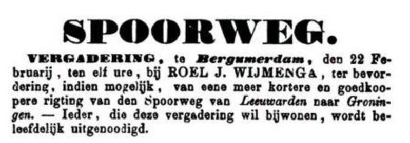 Nu de route is vastgesteld wordt men in Tietjerksteradeel alert. Te Bergumerdam, wordt op 22 februari 1861 bij Roel J. Wijmenga een vergadering belegd ter bevordering van een kortere en dus goedkopere route van de spoorweg van Leeuwarden naar Groningen. Blijkbaar dacht men aanvankelijk dat de route Leeuwarden-Groningen in een min of meer rechte lijn vlak ten noorden van Bergum werd aangelegd. Nu bleek de route aanzienlijk noordelijker, langs Veenwouden, te liggen. Het mocht niet baten.